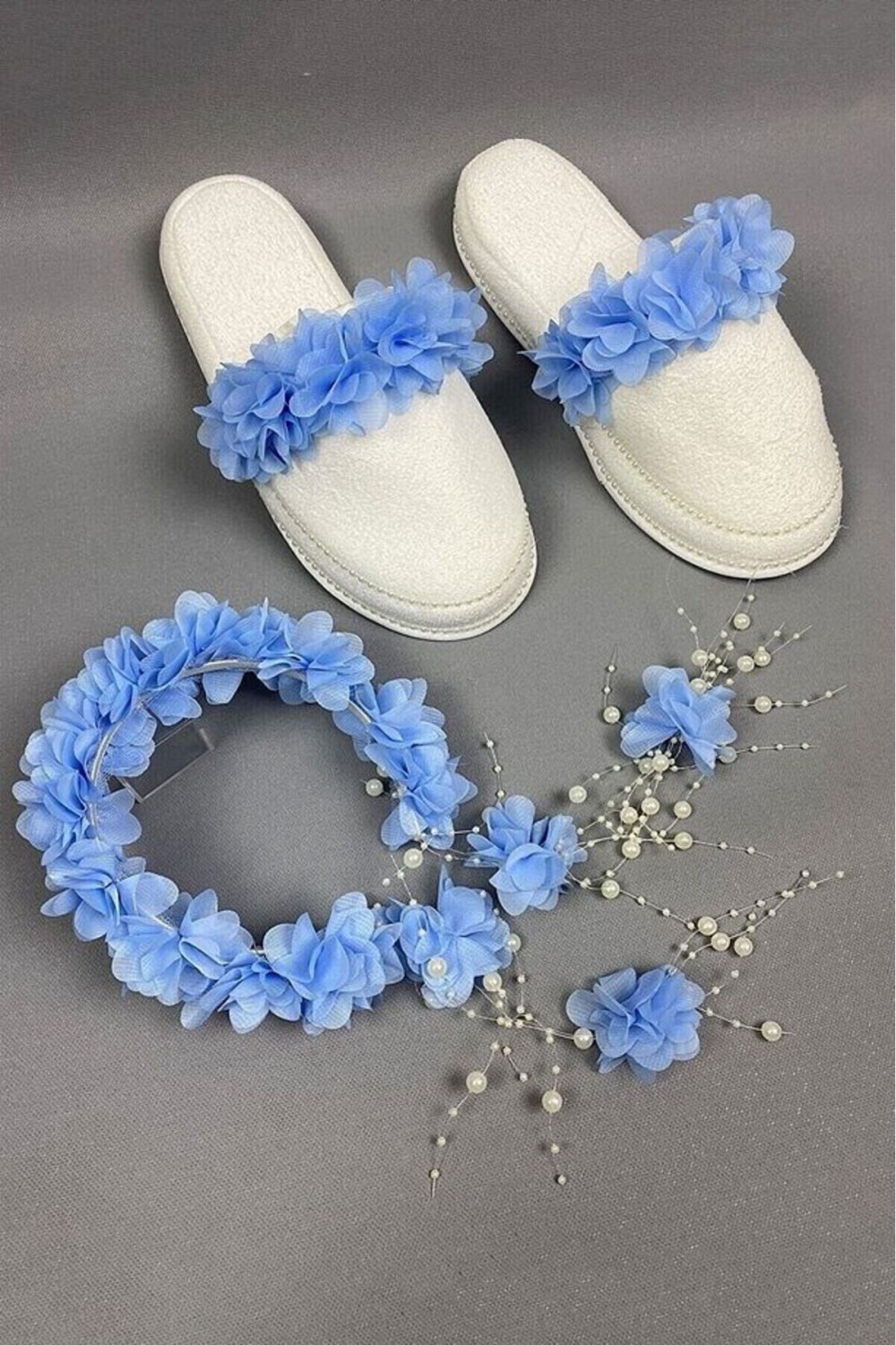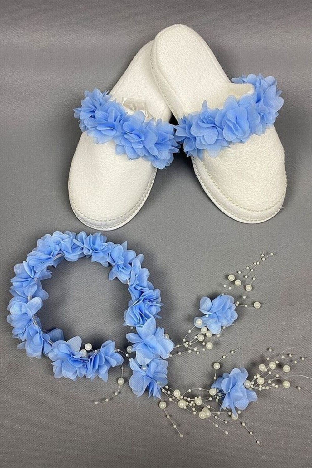 Bebek Mavisi Lazer Çiçekli İncili Taç Ve Lohusa Terlik Seti, Kadın Lohusa Seti
