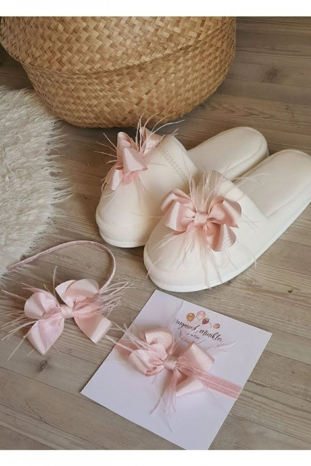 Lohusa anne-bebek seti, zarif tüylü fiyonk detayları ile annelere ve bebeklere rahatlık sunar. Yerli üretim, şık ve konforlu terlik & saç bandı kombini.